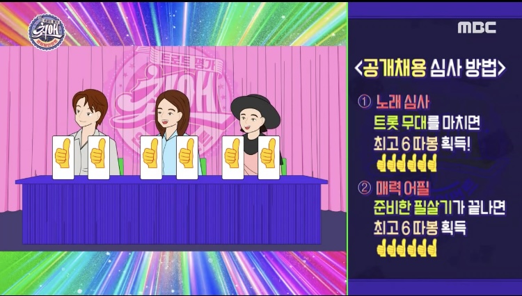 審査員は役員の3名、それぞれ2点(タボン)ずつの計6点(タボン)歌と魅力アピールをそれぞれ審査します。