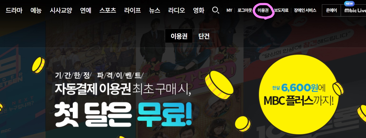 画面上部のメニューの「이용권」(利用券)をクリックします